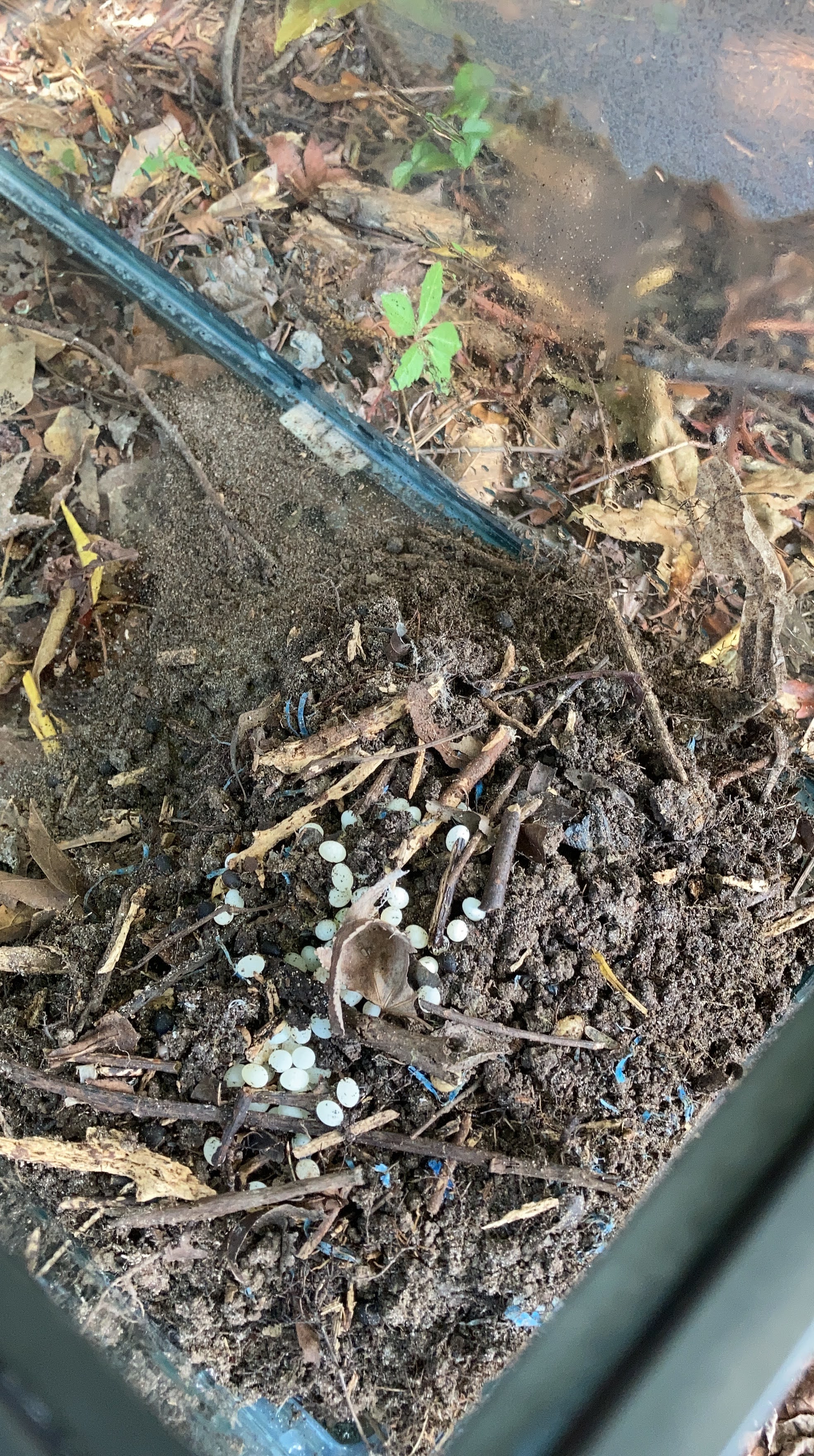 We found a nest of skink eggs while working in the yard. After disturbing the nest and scaring off the mother,we transferred them into a empty tank were we could monitor them. We will continue to monitor the temperature, moisture levels and activity. Make sure to watch the progress as they make their way into the world.